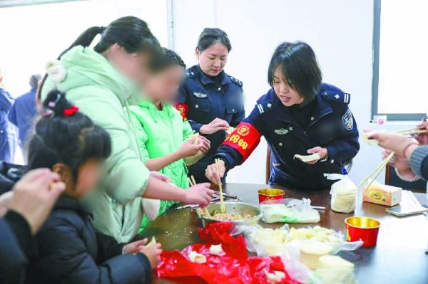 “爱心妈妈”和留守儿童一起包饺子。