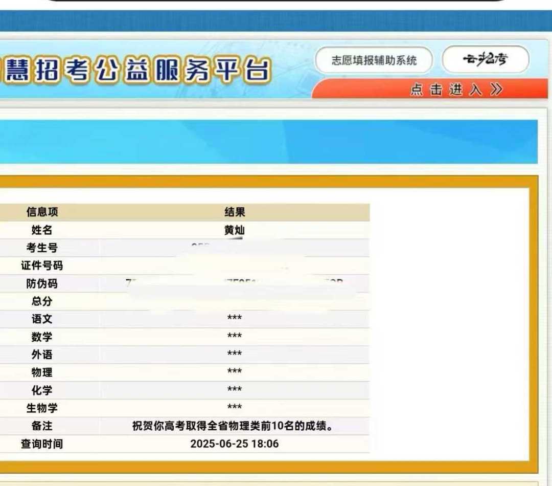 成绩没有显示,但页面“备注”栏,清晰写着:祝贺高考取得全省物理类前10名的成绩。
