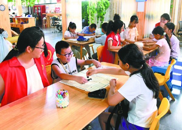 大学生志愿者陪孩子们下棋。郭明 摄