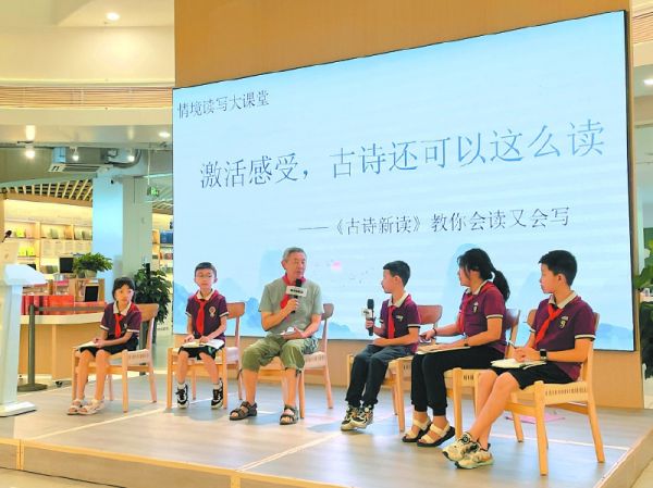 “可爱的小鹅,可爱的小鹅,弯着脖子朝天空唱什么?白白的羽毛水面浮……”邱易东以《激活感受,古诗还可以这么读》为题,从“读什么,怎么读”“触景生情,有感而发”“顺手拈来,脱口而出”“方法在诗中”四个方面开讲,用生动丰富的语言讲解古诗,将古诗与儿童成长、现实生活相关联,引导孩子们感受阅读与写作乐趣,鼓励孩子们保持好奇心,广泛涉猎不同类型的书籍,让阅读成为生活的一部分,会发现世界更加宽广、多彩。