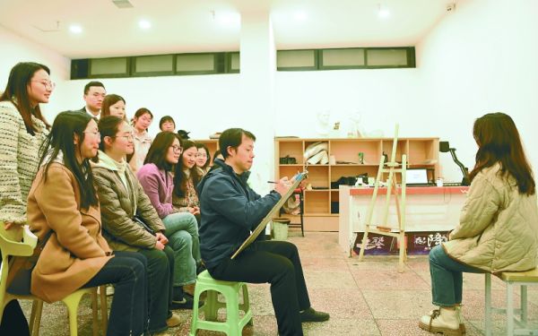 青年夜校内,授课老师示范人物速写技巧。(资料图)周亮 摄