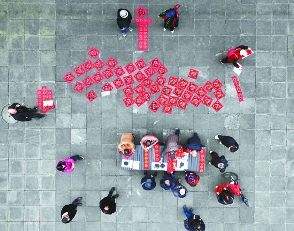 长桌前,书法爱好者们运笔起落间,“春临华堂添秀色,福到门庭聚祥光”等吉语跃然红笺;摊开的春联在青石板上错落铺展,红底黑字衬着古院落的飞檐木柱,年味已提前漫开。“手写的春联才有烟火气!”接过墨迹未干的“福”字,市民李阿姨笑着将其小心折好,“我要把这个挂在家里。”