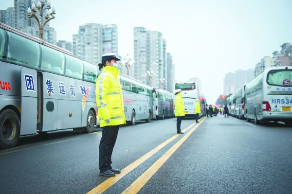 1月19日早上,在顺庆区镇江东路一段和滨江北路二段的交会处,市公安局交通管理支队直属四大队的10余名交警身着“荧光绿”,在此开始了一天的执勤任务。在执勤现场,交警们分工合作,一名交警站在道路中央指挥车辆有序通行,其余交警分别站在各路口,护送政协委员及群众安全通行。市公安局交通管理支队直属四大队大队长王国聪说:“为两会保驾护航,我们深感责任重大,使命光荣。”