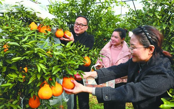冬日暖阳下,位于西充县东太乡鱼池寺村的四川天马山生态农业有限公司柑橘种植基地里蕴藏着勃勃生机。15日上午,西充县“一乡一季”暨东太乡第三届有机晚熟柑橘品果季在这里热闹开场。提着篮子的游客穿梭林间,亲手摘下还带着露水的柑橘,咬一口,汁水四溢,甜到心里。展销区前,乡亲们热情地招呼着,本地各种各样的晚熟柑橘、菜籽油、狮子糕、黄酒等土特产摆得满满当当,浓郁的乡土气息扑面而来。