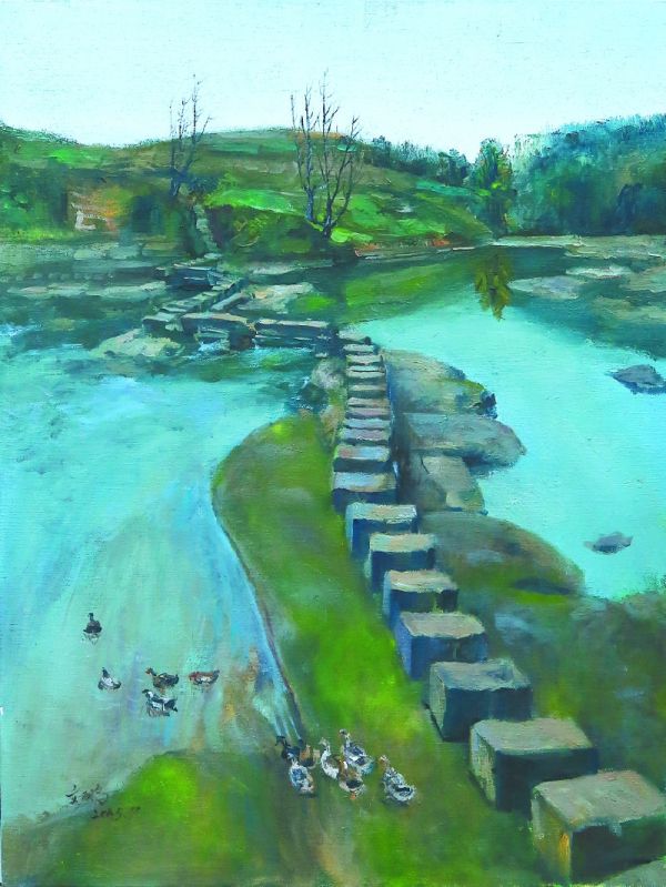 《嘉陵江畔》则采用现代色块拼接与肌理表现语言,将嘉陵江南充段的景致凝练为极具张力的视觉诗篇。该作品让熟悉的江景在艺术重构中焕发出新的韵味。“那几株简练的树,江面上零星的白鸭,还有背景里撞色的天际与屋舍,都是我心中‘山环水绕、烟火相依’的南充意象。”作者赵飞说。