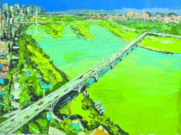 从李新春捕捉升钟湖秋日温暖的《升钟湖.秋》,到何秀文以高空俯瞰视角描绘的《嘉陵江》,创作者们不断变换观察家乡的维度。厚涂的油彩、强烈的色彩对比、抽象与具象的交融,诉说着这片土地的发展故事。
