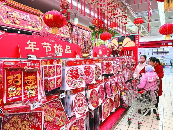 记者走访发现,眼下各大卖场以及临街店铺的春节饰品都销售火热,卖家在做好销售服务的同时,加紧备货,以满足市场需求。