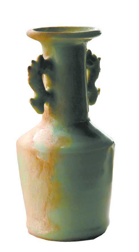 宋双系鱼耳青釉瓷瓶以其规整的造型与温润的釉色脱颖而出。邓婷介绍,该瓷瓶撇口、长颈,颈部对称塑有鱼耳双系,瓶身通体施青釉,釉色温润莹澈、质感细腻,将宋代青瓷“如玉似冰”的审美追求展现得淋漓尽致。作为研究同期制瓷工艺和窖藏文化的重要实物遗存,这件瓷瓶不仅体现了宋代手工业的精湛技艺,更反映了当时文人雅士的生活情趣与审美取向,其鱼形双系的设计既实用又富有寓意,是宋代瓷器中兼具功能性与艺术性的典型代表。