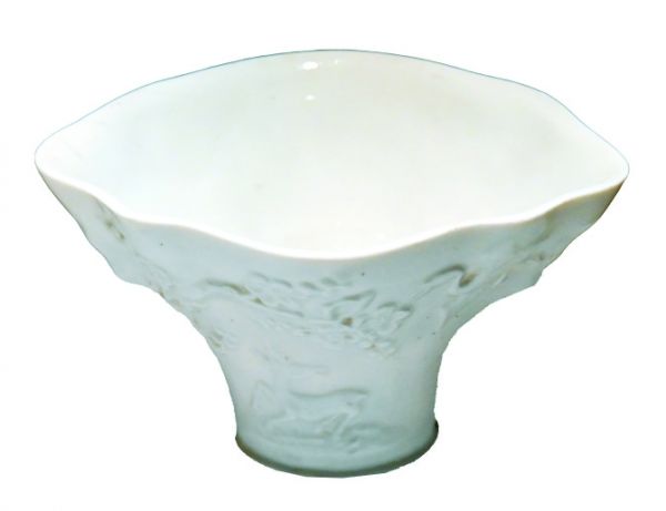 特点:该杯长11cm,宽9cm,高6.1cm,底径4cm,器身仿犀角造型,口沿呈花瓣状外侈,圈足设计稳固端庄。杯身通体施白釉,仅足端露胎,釉色洁白温润,宛如羊脂白玉。外壁贴塑的龙、虎、鹤、鹿、梅花等纹样栩栩如生,体现了清代工匠高超的塑形技艺。