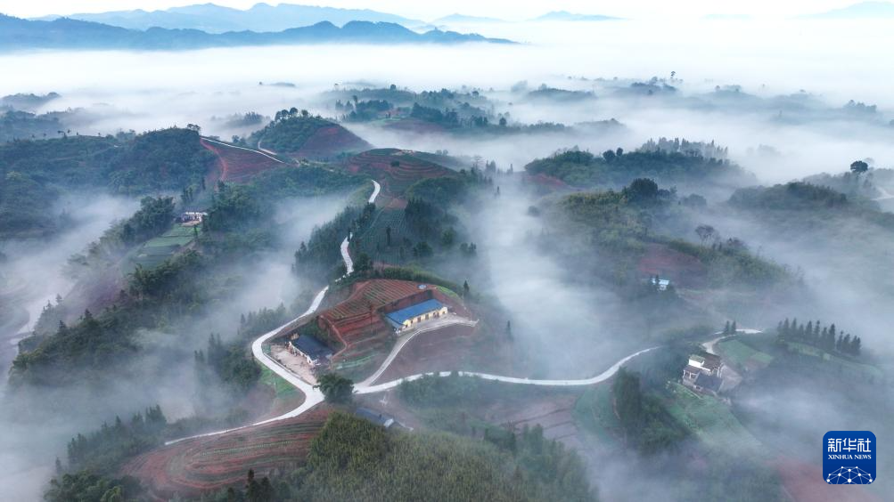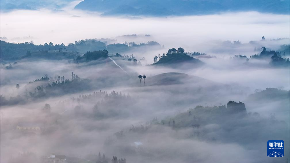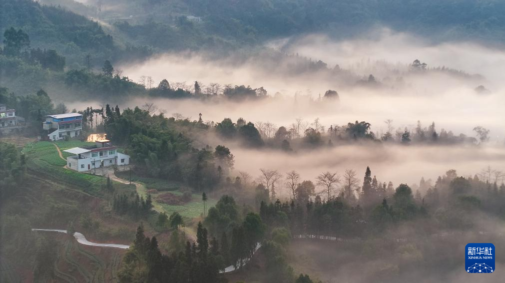 四川省泸州市纳溪区大渡口镇凤凰湖村晨雾弥漫,宛若仙境(1月19日摄,无人机照片)。