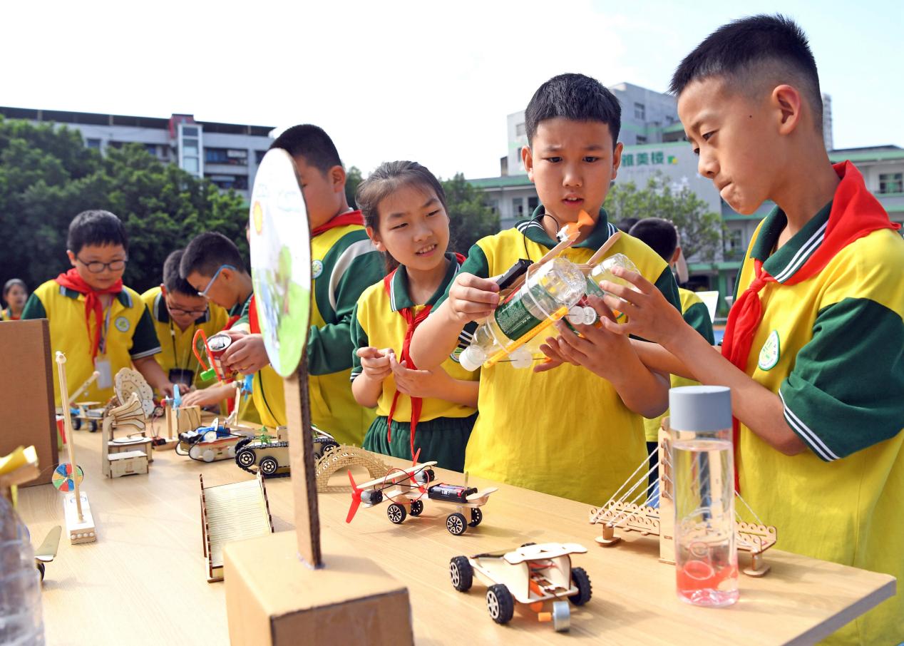 4月22日,南充市蓬安县实验小学学生在读书节活动中展示学习科创手工作品。