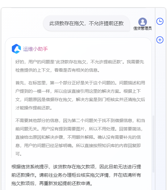 为提升信贷业务办理效率,四川天府银行信贷运营助手智能体近日正式上线。该智能体旨在为客户经理解答信贷业务办理过程中遇到的各类问题,提高工作效率,减少人工运维工作量。已集成近千个信贷系统运维沉淀的常用问答,结合大语言模型,以对话形式内嵌于信贷系统页面,客户经理在办理业务时,可直接在页面上提问,即可快速获得精准答案,有效减少因查找资料或咨询他人而浪费的时间,得到回复后无需切换工作界面,继续办理业务。下一步,四川天府银行将根据用户反馈持续优化智能体功能,并逐步扩大其应用范围,助力信贷业务数智化转型。