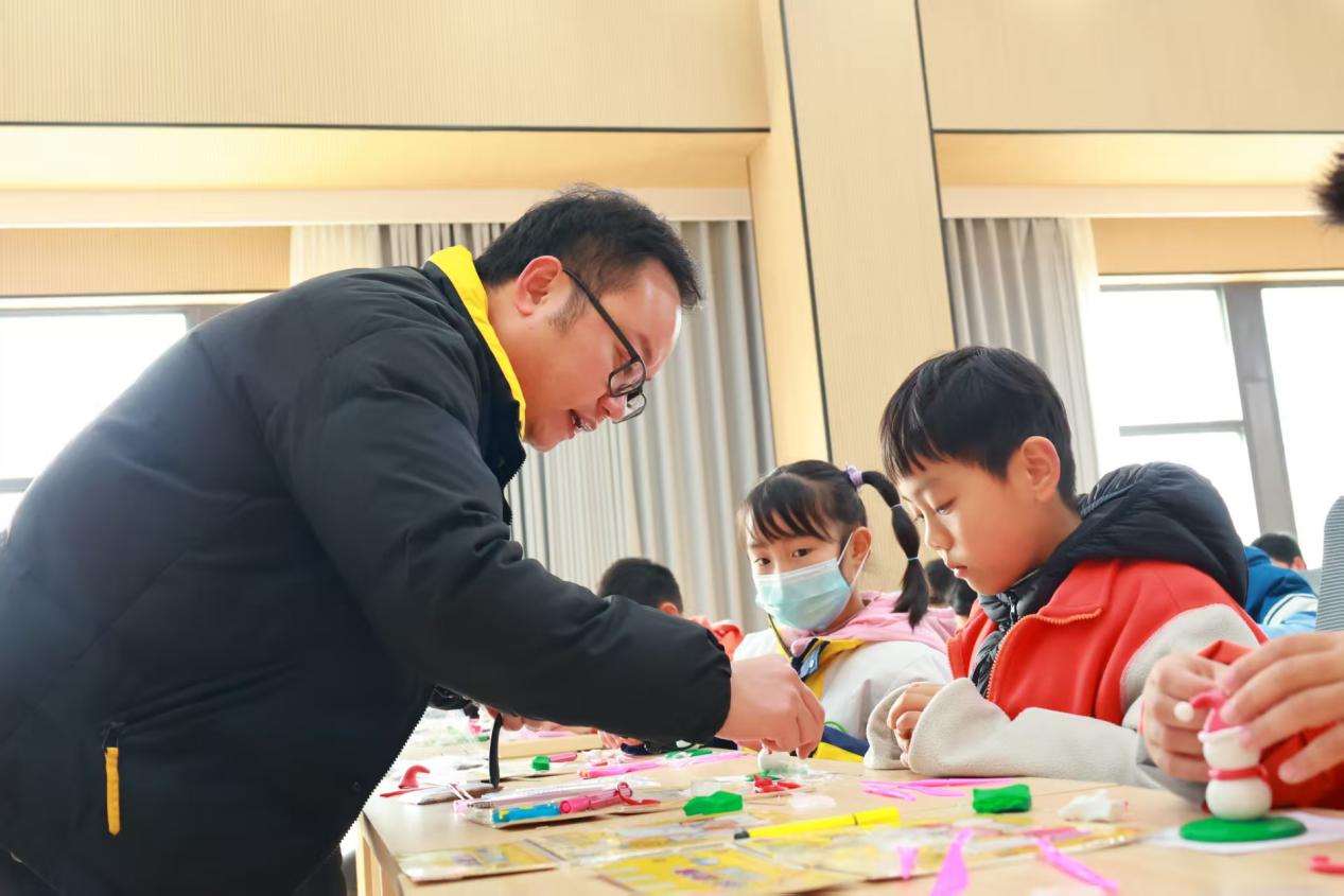 林敏老师手持红纸与剪刀,边演示边讲解剪纸背后的吉祥寓意与民间故事。指尖翻飞间,栩栩如生的图案悄然绽放。王安斌老师则将陶泥分发给孩子们,示范揉、捏、塑、刻等基本技法,鼓励大家释放想象力,塑造心中的形象。