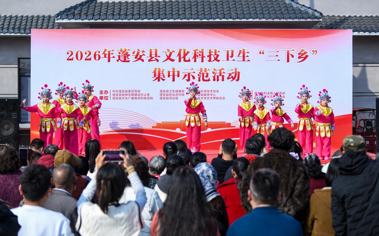 2月6日,四川省南充市蓬安县2026年文化科技卫生“三下乡”集中示范活动在蓬安县利溪镇郑家坝村举行。此次活动聚焦农村发展需求,通过开展文化下乡巡演、科技科普培训、医疗卫生服务、法治宣传教育等活动,给群众送去新春的祝福和实实在在的贴心服务。