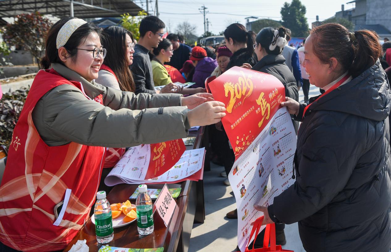 文化志愿者给群众免费发放日历。