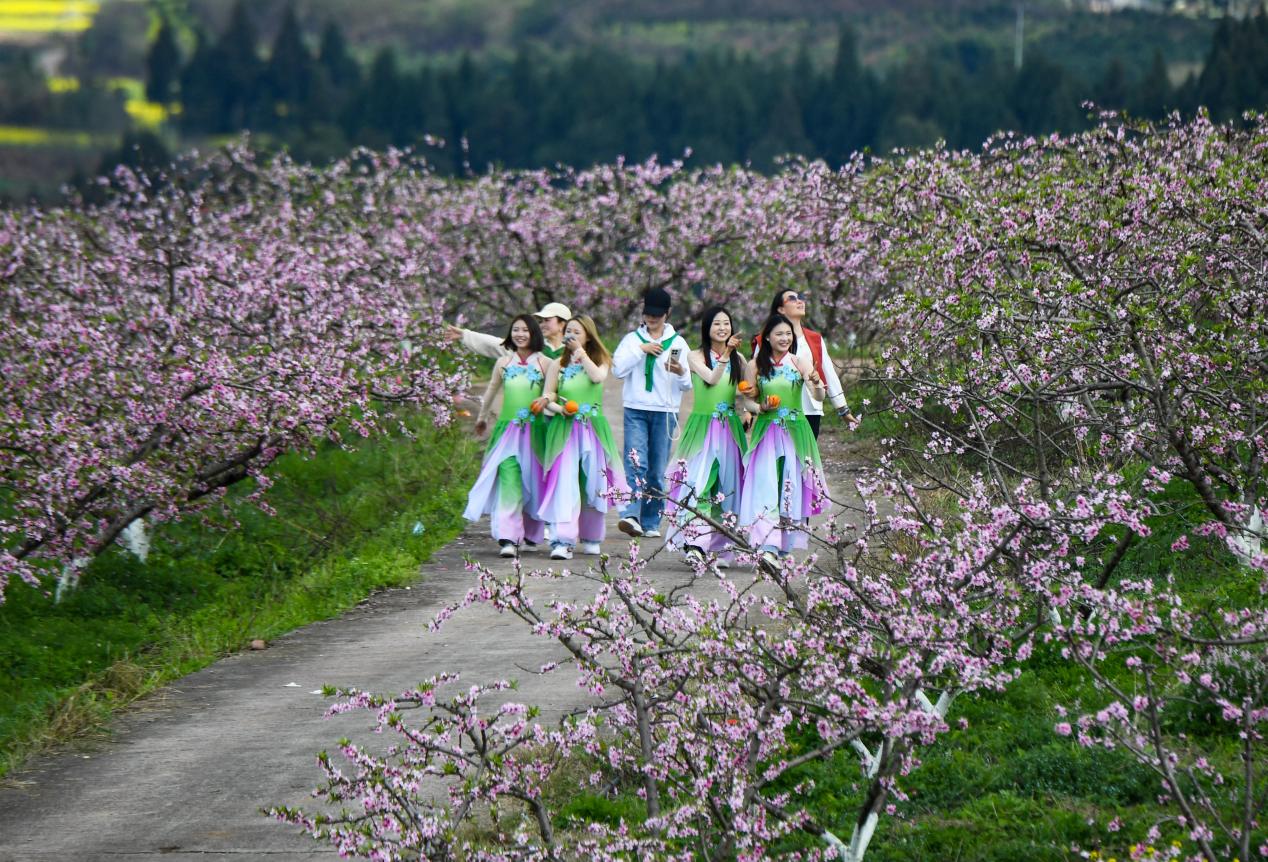 移步桃李产业园,粉白花瓣随风轻舞、落英缤纷,花海与青山绿水相映成趣。游客们或穿行花间打卡拍照,定格烂漫春光;或驻足品尝乡土美食、畅购农家土货,沉浸式感受田园浪漫与烟火气息;亲子游乐、田园漫步、民俗体验等多元业态,让春日乡村游更具吸引力。春日里的蓬安,正以花为媒、以节聚势,让“美丽经济”在田间地头绚烂绽放,为乡村发展注入强劲新活力,也让村民的幸福生活节节攀升。